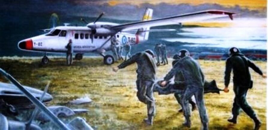 The sheep shearing sheds and other buildings were taken over and a Skyvan from Stanley Airport was used to bring in personnel and stores.