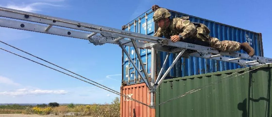 In the context of urban operations, gaps are likely to be wider and personnel encumbered with weapons, radios, ammunition and other stores, making traversing open ladders dangerous and slow. For vertical access, the same components are used. Un-tensioned, to a height of 10m and with the tensioning systems, 18m. In most cases, personnel would simply use the ladder sections in a conventional manner.